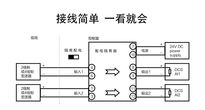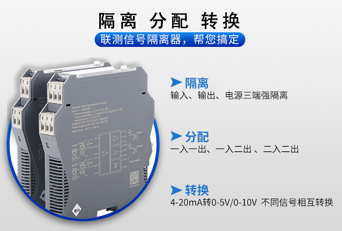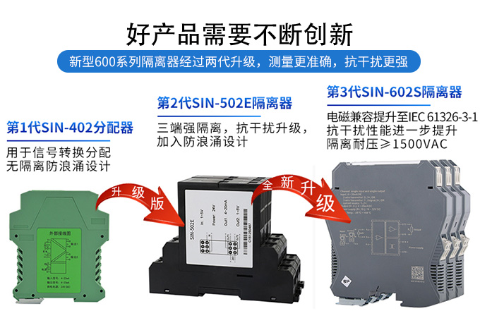 新款隔離器可向變送器提供隔離的工作電源,同時檢測回路中的電流,經隔離變送輸出電流或電壓信號。 輸入端、輸出端及電源端三端隔離,具有響應快、功耗低、溫度特性好等優點。