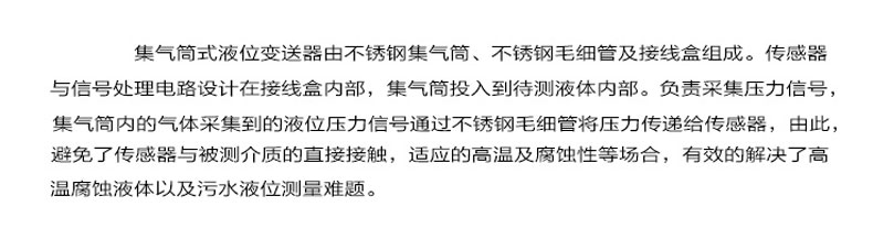 集氣桶式液位變送器(下稱變送器)用于測(cè)量較高溫度液體介質(zhì)的液位,原理是被測(cè)液體介質(zhì)壓縮集氣桶內(nèi)的空氣,空氣壓力通過(guò)毛細(xì)管傳遞給敏感元件,敏感元件本身不與被測(cè)介質(zhì)直接接觸,因此變送器可以應(yīng)用在較高溫度的介質(zhì)環(huán)境中,同時(shí),內(nèi)置微型信號(hào)放大處理電路,可以直接與計(jì)算機(jī)接口卡、控制儀表、智能儀表或 PLC 等連接,進(jìn)行遠(yuǎn)程傳輸。變送器廣泛應(yīng)用于環(huán)保、水利、供水、工業(yè)過(guò)程控制、變頻供水等較高溫度介質(zhì)的液位測(cè)量。