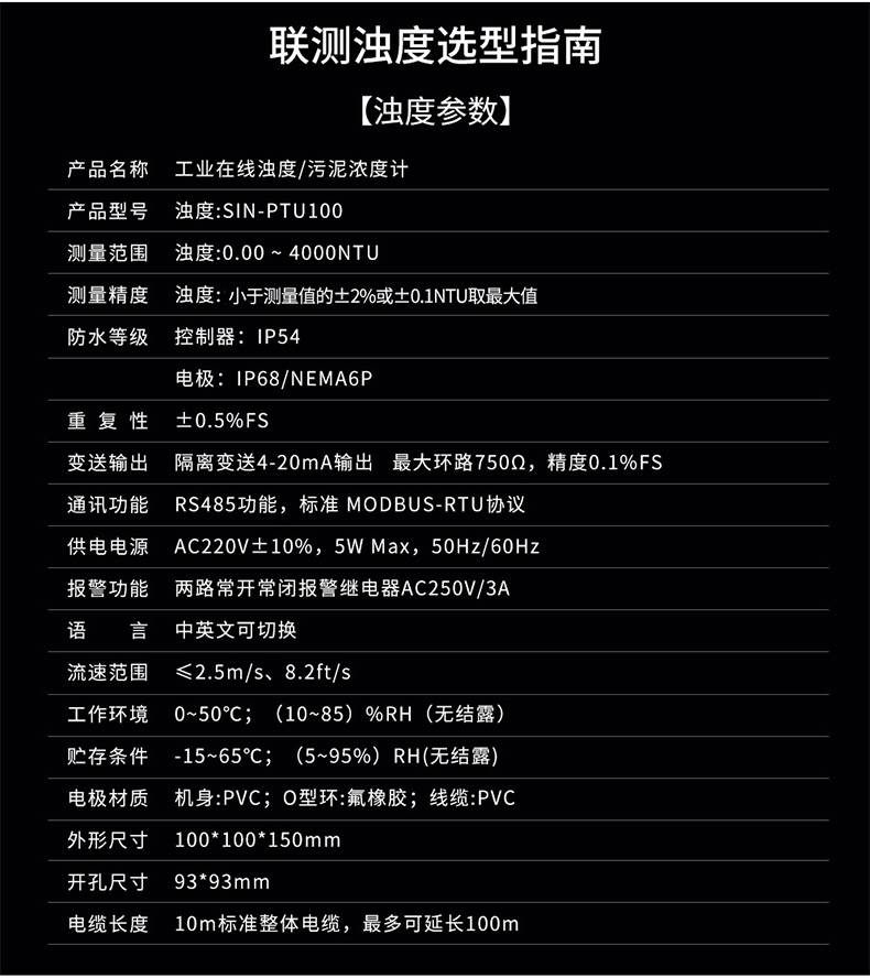 聯(lián)測SIN-PTU100在線濁度分析儀內(nèi)置微處理器,適用于于污水廠、自來水廠、水站、地表水、工業(yè)等領域濁度監(jiān)測,例如:污水廠沉淀池、造紙漿液池、提升泵站、氧化溝濁度測量等。